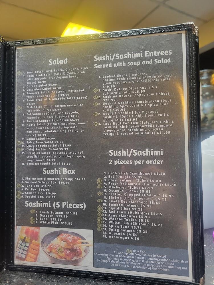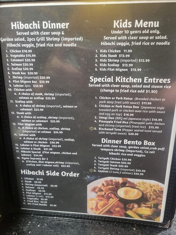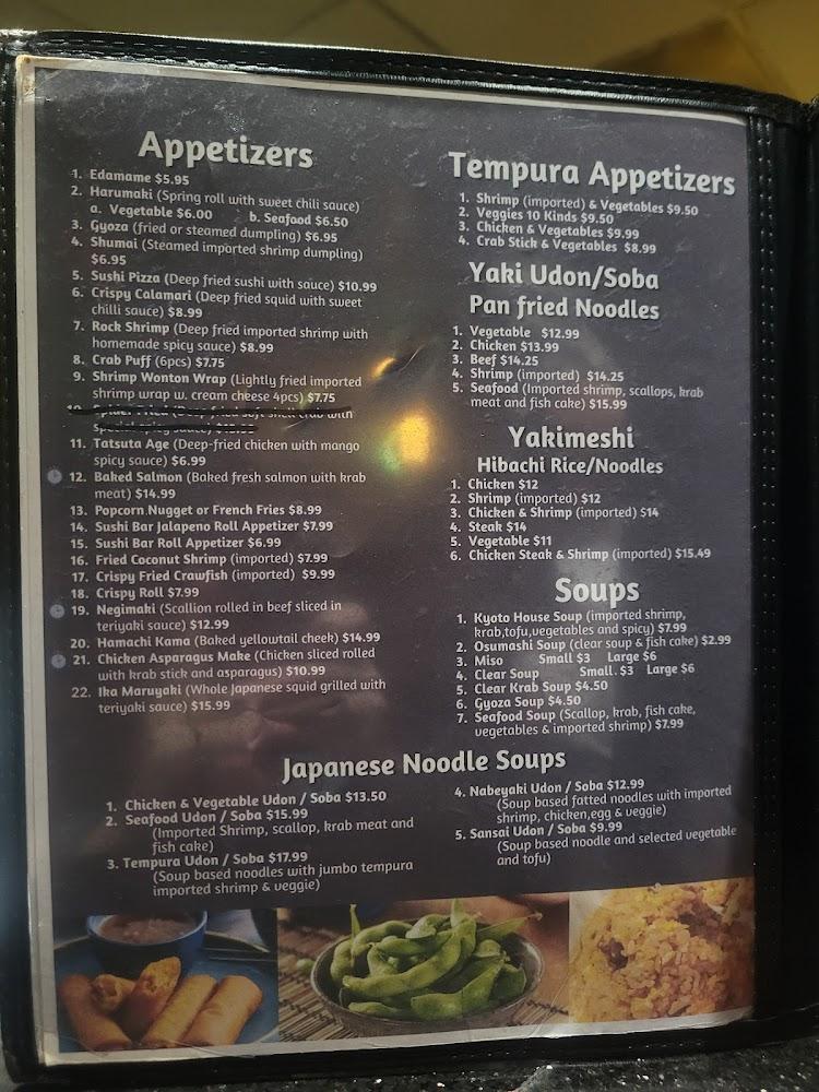 The menu at Kyoto Japanese Cuisine is extensive, featuring over 120 different dishes. It includes a variety of sushi rolls, hibachi items, and Japanese noodles. Diners can explore a range of appetizers, such as edamame, gyoza, and crab rangoon, known for its generous sizes. For the main course, hibachi lovers can savor chicken, shrimp, or steak cooked to perfection. There's also a selection of authentic noodle soups, offering comfort and flavor. The restaurant emphasizes fresh ingredients, ensuring high quality in every bite. Vegetarian options are available, showcasing a commitment to cater to diverse dietary preferences. The bento boxes provide a harmonious blend of flavors and variety on one plate. Customers can find various drinks, including beers and wines, enhancing their meals and making each visit unique.
